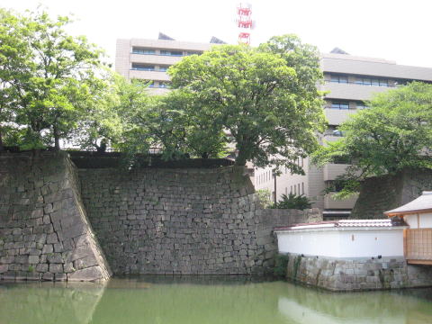 写真の右側に少し写っているのが再建された御廊下橋です。]
